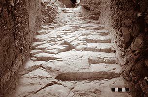 Korridor 11 führt abwärts, und besitzt auf etwa zwei Drittel seiner Länge gut gearbeitete Treppenstufen. Als wir hier mit der Freilegung begannen, dachten wir, daß uns dieser Korridor vielleicht zu einer tiefer liegenden Ebene von Räumen führt, tiefer als die der Opferkapellen entlang der Korridore 7, 10 und 11 . Aber dem war nicht so. Statt dessen endete er einfach. Die Kammern am Ende von Korridor 11 haben einen besonders gut gearbeiteten Estrich auf dem Fußboden - eine Seltenheit in altägyptischen Gräbern. Im Geröll fanden sich Teile von Fayence, ein Ostrakon (Kalksteintäfelchen), sowie eine große Anzahl Tonscherben. |